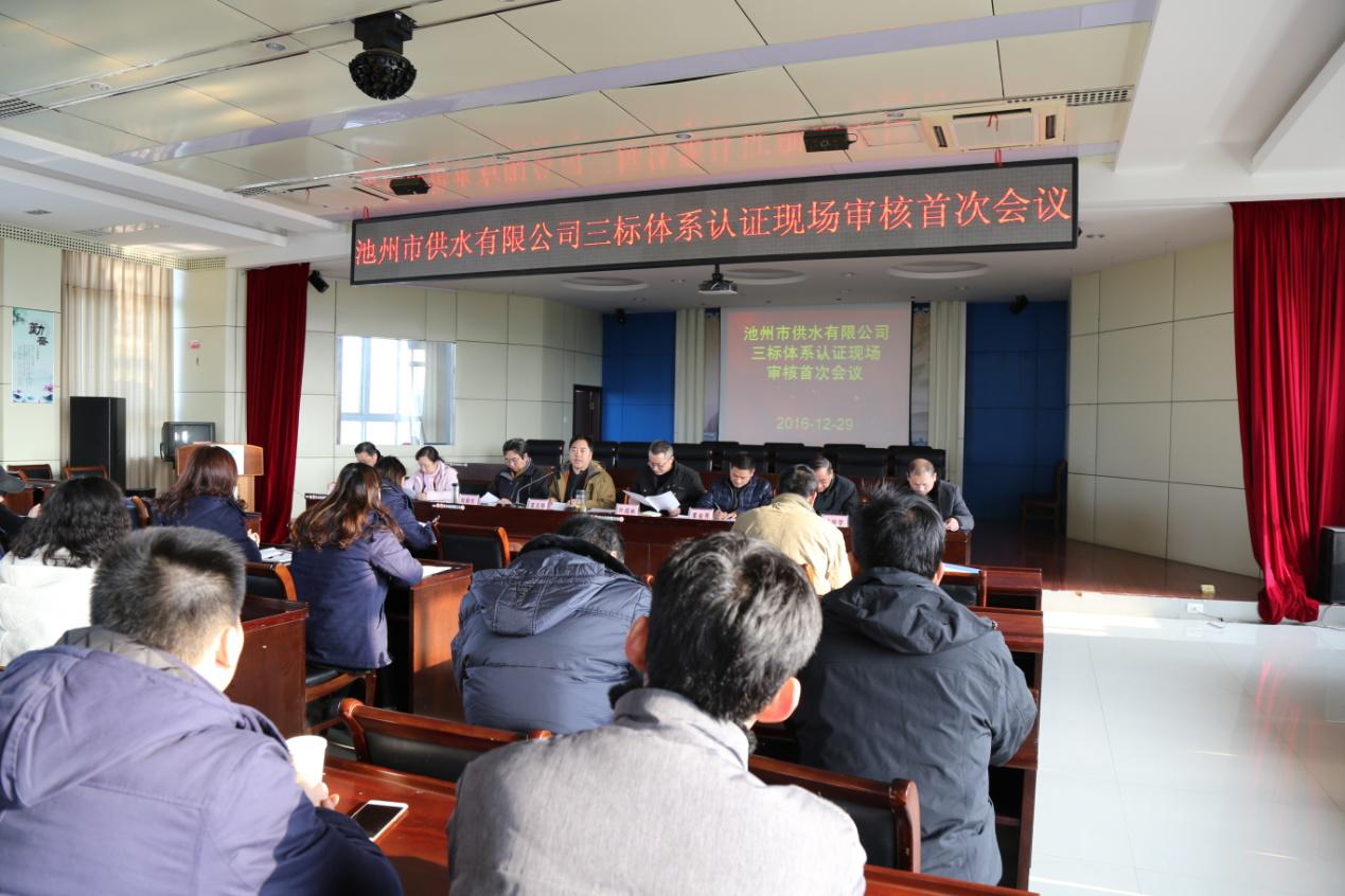 2016年12月29-31日,經(jīng)過第三方上海恩可埃認證有限公司專家為期三天的審核,池州市供水有限公司“三標一體”管理體系即質(zhì)量、環(huán)境、職業(yè)健康安全管理體系運行符合標準要求,順利通過認證審核,正式獲得“三標一體”管理體系認證。
