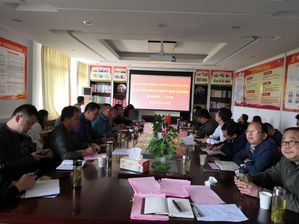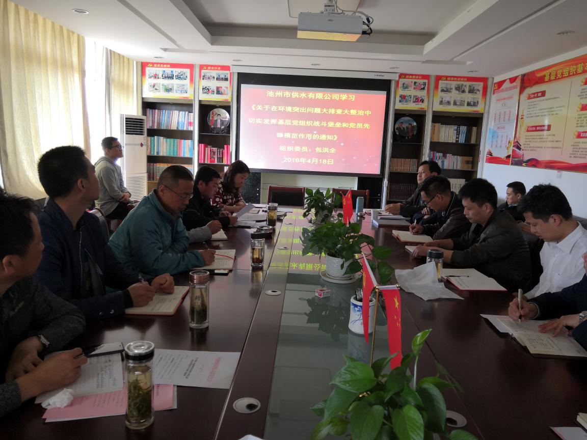 根據(jù)上級黨組織文件要求,2018年4月18日,池州市供水有限公司黨支部組織全體黨員和入黨積極分子學(xué)習(xí)了《習(xí)近平總書記關(guān)于生態(tài)文明和環(huán)境保護重要論述摘編》和市委組織部《關(guān)于在環(huán)境突出問題大排查大整治中切實發(fā)揮基層黨組織戰(zhàn)斗堡壘和黨員先鋒模范作用的通知》。