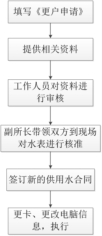 2、用戶將相關(guān)材料準(zhǔn)備妥當(dāng)之后向工作人員遞交,相關(guān)工作人員負(fù)責(zé)對遞交材料進(jìn)行審核,同時(shí)聯(lián)系用戶所在轄區(qū)的供水所副所長。副所長接到指令,在五個(gè)工作日之內(nèi)與用戶雙方(賣方與買方)到現(xiàn)場對相關(guān)水表底度進(jìn)行核準(zhǔn),如發(fā)現(xiàn)問題,應(yīng)當(dāng)面向買賣雙方指出,并聯(lián)系材料審核人員錄入新的底度。用戶不