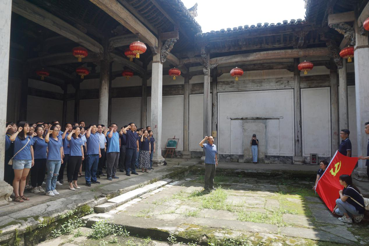 參觀完家風(fēng)家訓(xùn)館后,大家前往陵陽(yáng)鎮(zhèn)北上抗日先遣隊(duì)駐地舊址。這里既是陳氏宗祠也是抗日先遣隊(duì)駐地舊址,1934年12月,紅軍北上抗日先遣隊(duì)曾在此宿營(yíng),司令部就設(shè)在陳氏宗祠中。大家認(rèn)真觀看一組組珍貴的歷史圖片和文獻(xiàn)資料,體會(huì)這棟古建筑里不屈不撓艱苦奮斗的時(shí)代痕跡,切身感受革命先烈對(duì)黨忠誠(chéng)、無私奉獻(xiàn)、不懼犧牲的革命精神,全體黨員深受震撼,思想上受到一次深刻的洗禮。最后,在供水公司黨支部書記鐘誠(chéng)的帶領(lǐng)下,全體黨員一道舉起右拳、面對(duì)黨旗、莊嚴(yán)宣誓。“我志愿加入中國(guó)共產(chǎn)黨,擁護(hù)黨的綱領(lǐng),遵守黨的章程……永不叛黨!币蛔忠痪,鏗鏘有力,愛國(guó)愛黨之情油然而生。
