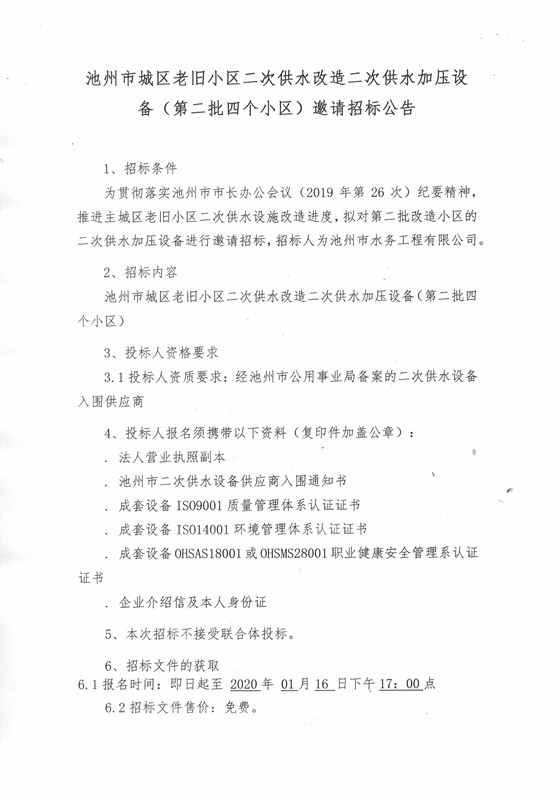 | 池州市城區(qū)老舊小區(qū)二次供水改造二次供水加壓設備(第二批四個小區(qū))邀請招標公告 | |