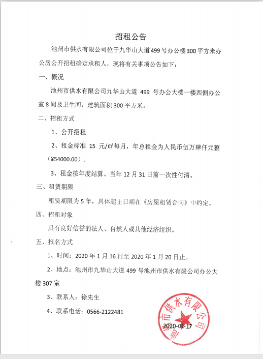 ----------------------------------------------------------------------------------- 上一篇:流標(biāo)公示 下一篇:池州供水營業(yè)廳暫停營業(yè)的通知 |