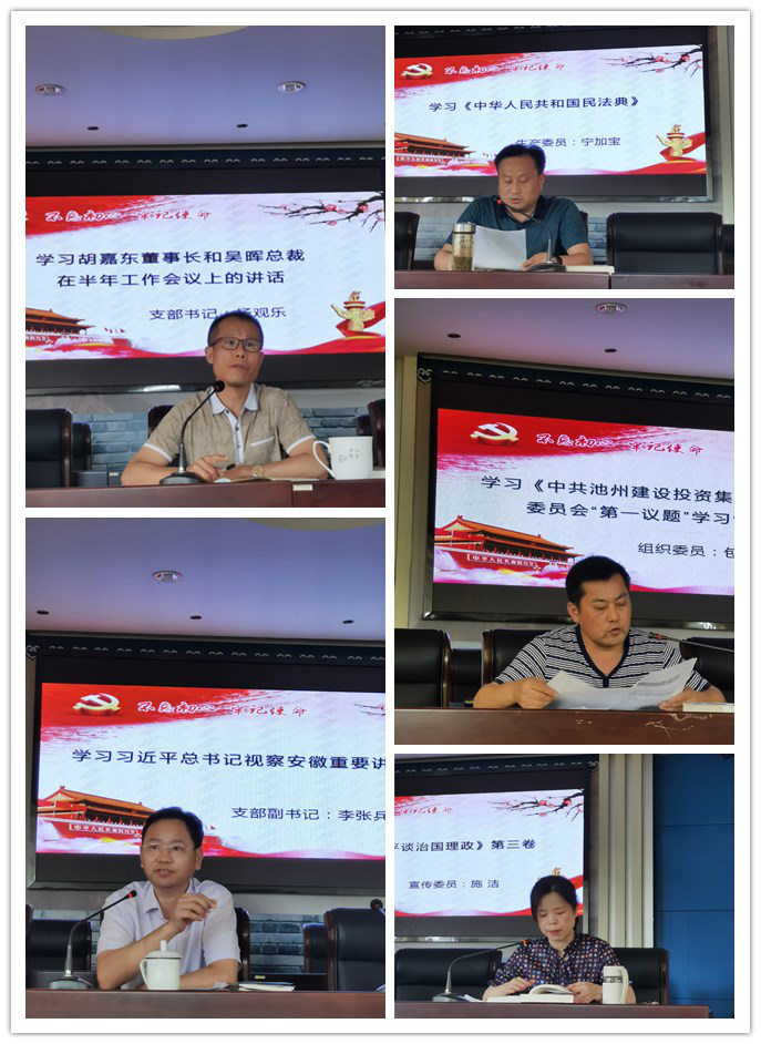 會議首先由宣傳委員領(lǐng)學(xué)《習(xí)近平談治國理政》第三卷中《全面把握中國特色社會主義進入新時代的新要求》《全面貫徹新時代中國特色社會主義思想和基本方略》《新時代要有新氣象,更要有新作為》等重點篇目。隨后,各支委分別帶領(lǐng)大家學(xué)習(xí)《民法典》、習(xí)近平總書記視察安徽重要講話精神、吳躍勤同志先進事跡,并傳達(dá)了《中共池州建設(shè)投資集團有限公司委員會“第一議題”學(xué)習(xí)制度》《池州市市屬企業(yè)違規(guī)經(jīng)營投資責(zé)任追究實施辦法(試行)》以及胡嘉東董事長和吳暉總裁在半年工作會議上的講話精神等。