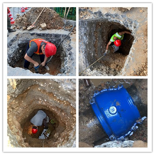 為避免損壞光纖、燃?xì)獾绕渌艿溃瑩屝揸?duì)員們開挖基坑十分小心。經(jīng)過7個(gè)小時(shí)的持續(xù)人工挖掘,終于把漏水點(diǎn)所在的管道全部挖出。經(jīng)再次檢查,確認(rèn)為DN300管道破裂。搶修隊(duì)員深入環(huán)境惡劣的基坑,完成破損管道搶修工作。