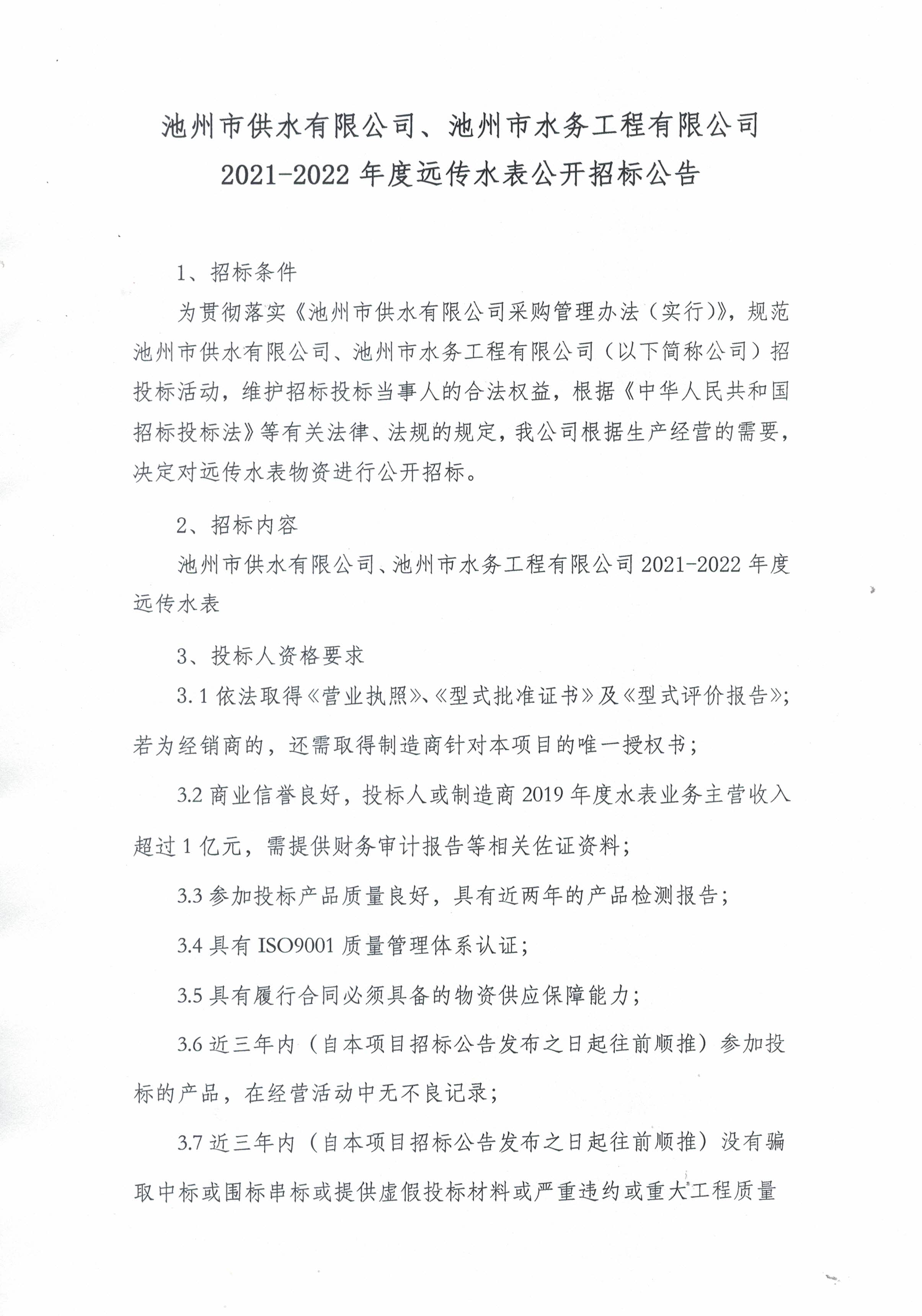 | 池州市供水有限公司、池州市水務(wù)工程有限公司2021-2022年度遠(yuǎn)傳水表公開招標(biāo)公告 | |
