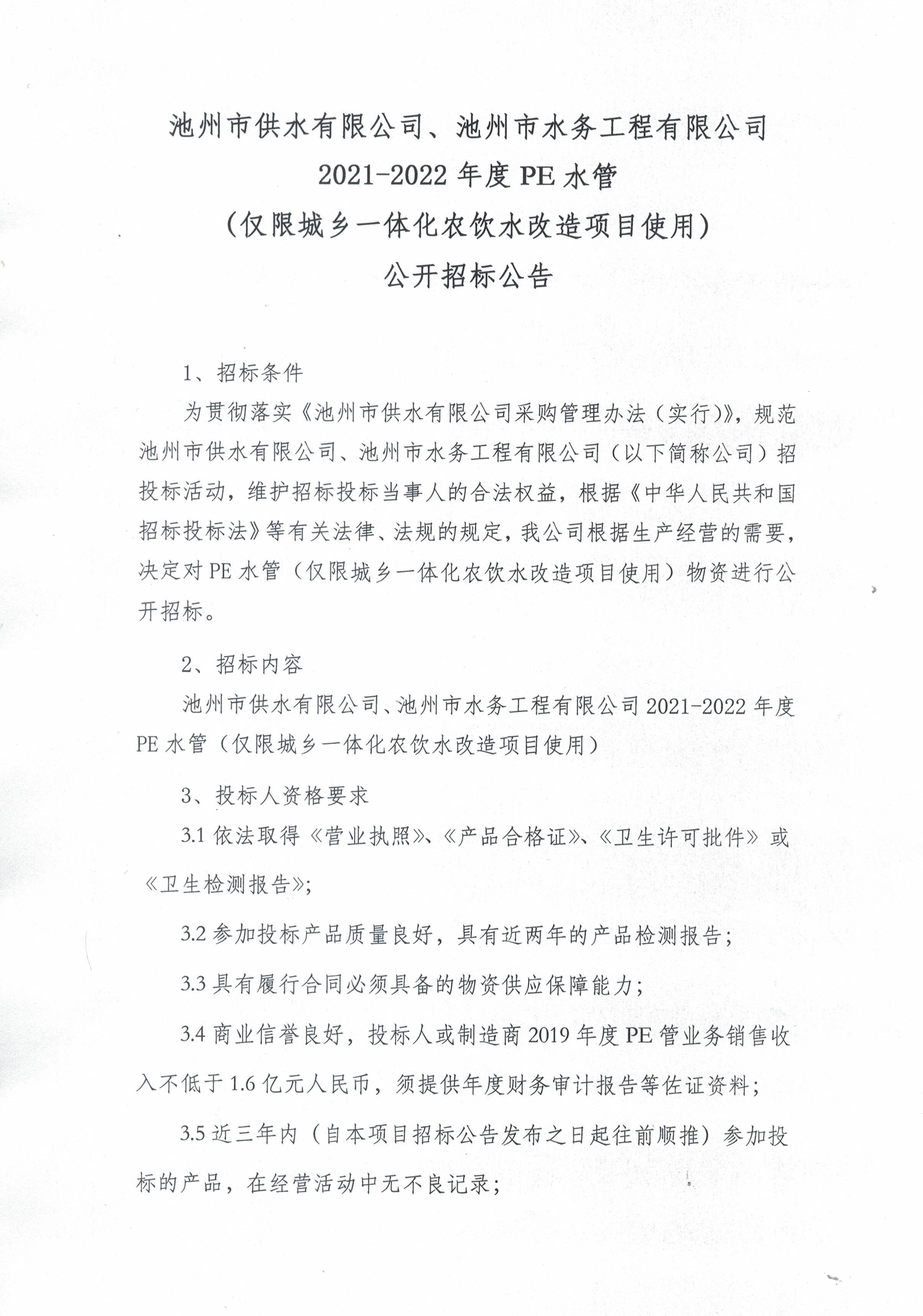 | 池州市供水有限公司、池州市水務工程有限公司.2021-2022年度PE水管(僅限城鄉(xiāng)一體化農(nóng)飲水改造 | |