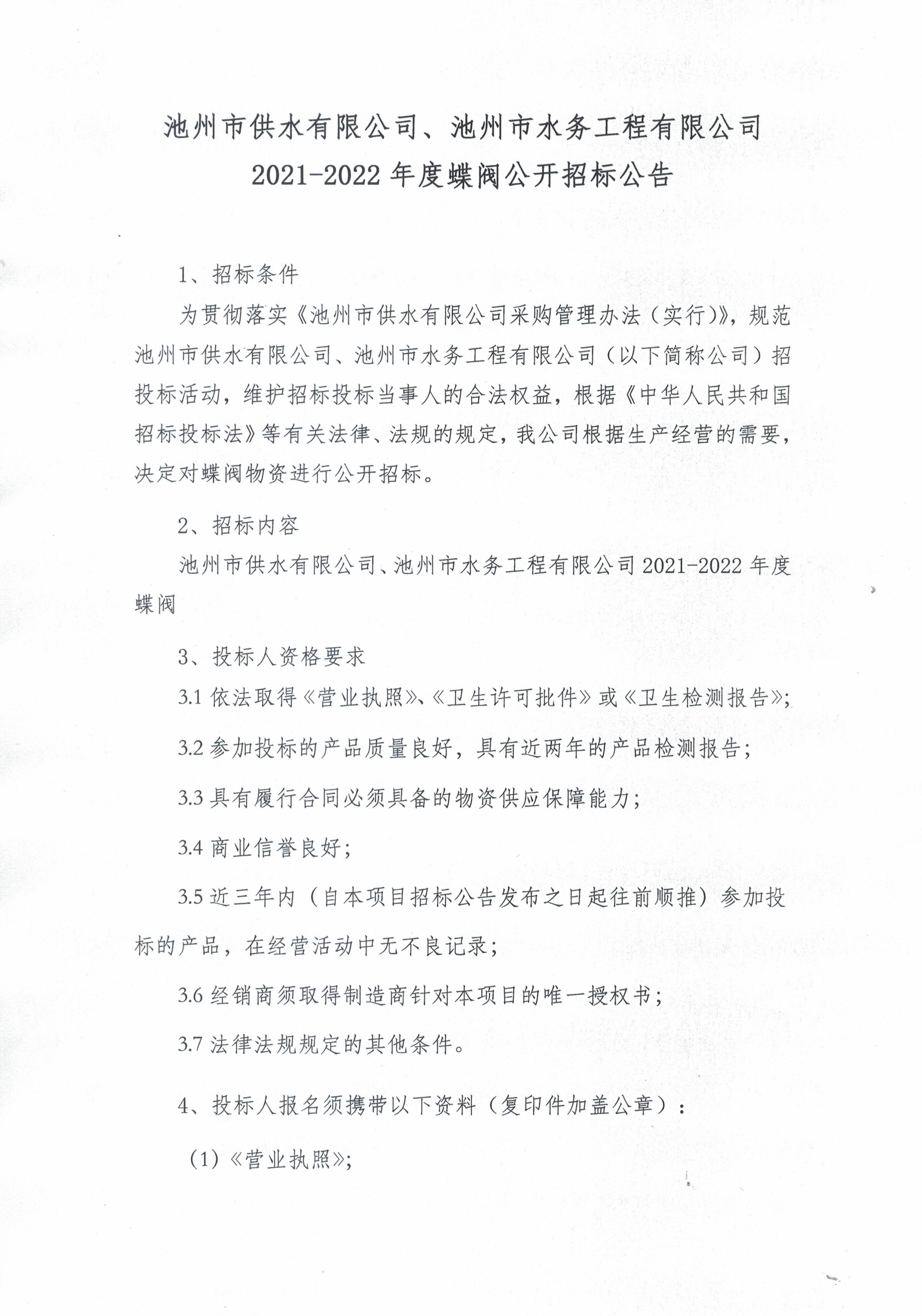 | 池州市供水有限公司、池州市水務工程有限公司2021-2022年度蝶閥公開招標公告 | |