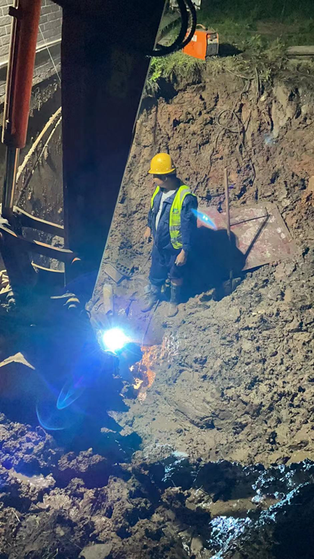 下午16:00,施工人員組織開挖尋找漏點,發(fā)現(xiàn)漏點后,準備進行停水維修,但因漏點在出廠主干管道上,若停水施工將造成城區(qū)大范圍水壓下降,局部地區(qū)甚至中斷供水。正在施工人員困擾之際,現(xiàn)場技術(shù)人員經(jīng)過仔細商討,提出了一個非常巧妙地解決辦法。由于管道破損點很小,破損點周圍管道狀況良好,未出現(xiàn)擴散性裂痕,技術(shù)人員提議采用“打補丁”的辦法對管道進行維修,用一塊鋼板下面墊上橡膠片堵住漏點,四周用螺栓錨固,再將鋼板四周與管道焊接牢固,用這樣一塊“補丁”封堵迅速漏點。