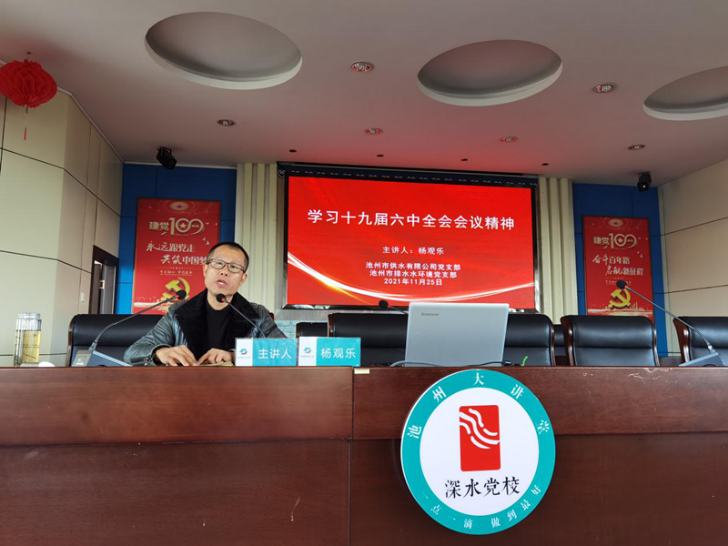 11月25日,池州市供水、排水、水環(huán)境公司黨支部聯(lián)合開(kāi)展深水黨!こ刂荽笾v堂第7期,支部書(shū)記楊觀(guān)樂(lè)傳達(dá)學(xué)習(xí)黨的十九屆六中全會(huì)精神,宣傳委員施潔上《一樣的初心,不一樣的精彩》專(zhuān)題黨課。