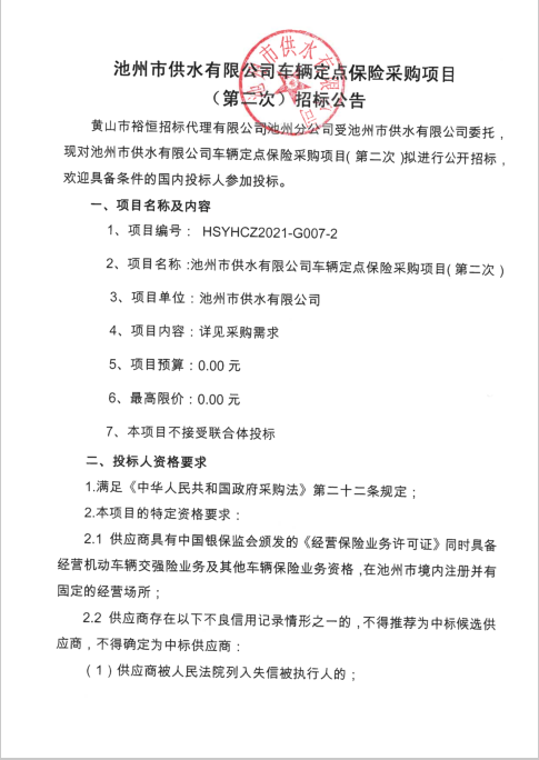 | 池州市供水有限公司車輛定點(diǎn)保險(xiǎn)采購(gòu)項(xiàng)目(第二次)招標(biāo)公告次) | |