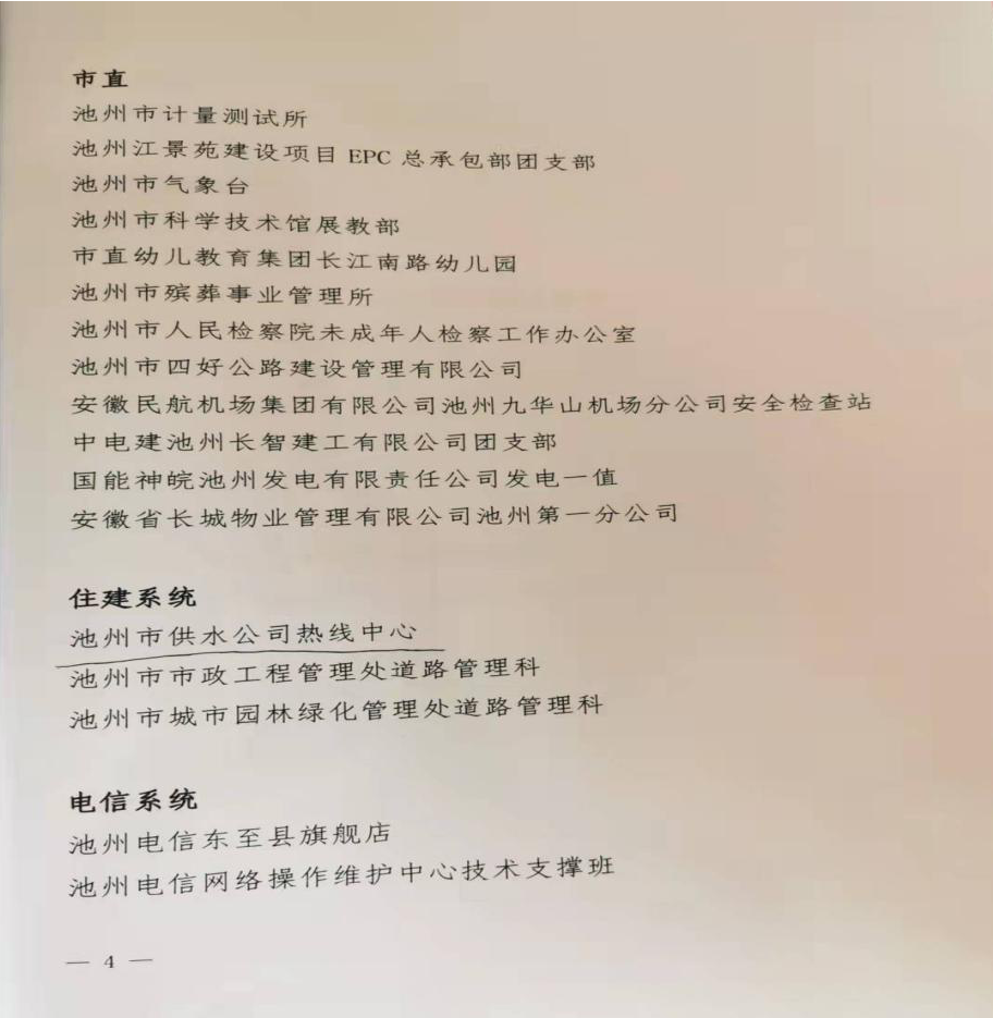 近日,共青團委聯(lián)合多個單位共同發(fā)布《關(guān)于命名2020-2021年度池州市青年文明號的決定》,經(jīng)過長期的努力和奮斗,池州供水公司熱線中心從眾多創(chuàng)建集體中脫穎而出,獲評2021年度市級“青年文明號”稱號!這也是熱線中心繼2015年之后,再次榮獲該榮譽稱號。