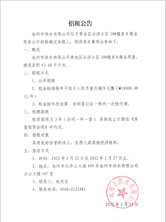 | 池州市供水有限公司興濟小區(qū)30號樓東8門面房出租公告 | |