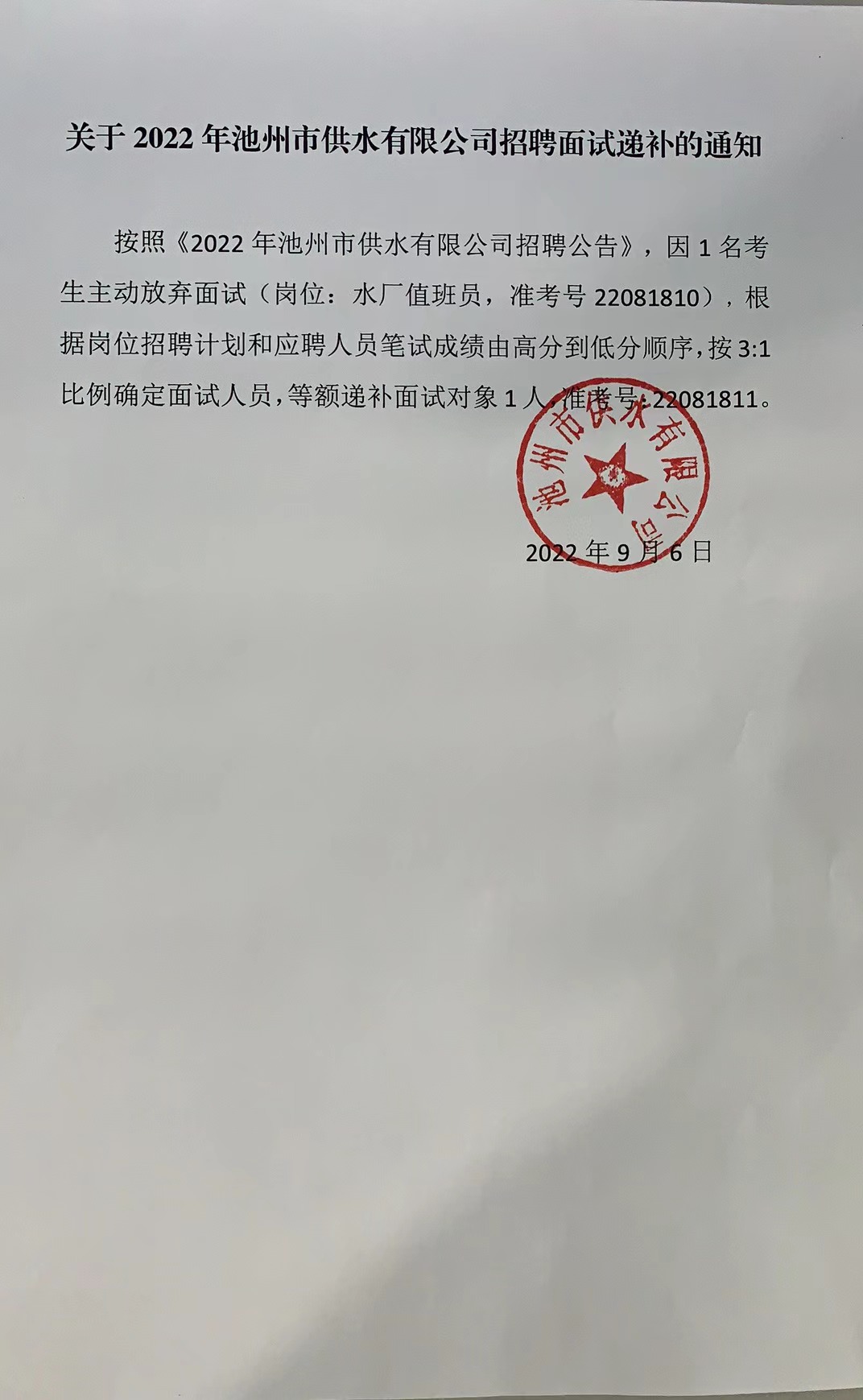 | 關于2022年池州市供水有限公司招聘面試遞補的通知 | |