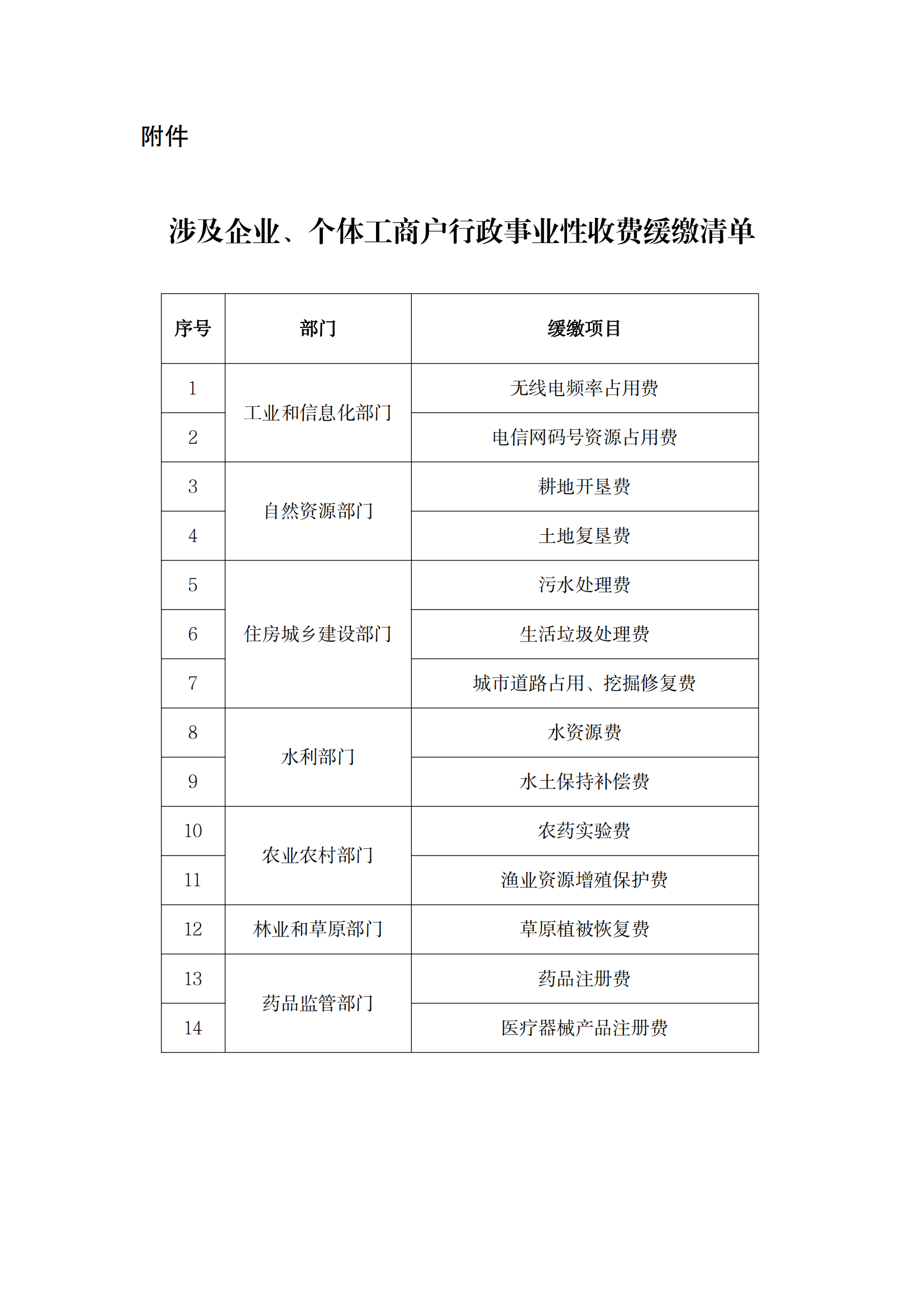 二、《涉及企業(yè)、個體工商戶行政事業(yè)性收費緩繳清單》包括耕地開墾費、污水處理費等14項收費(具體項目見附件)。