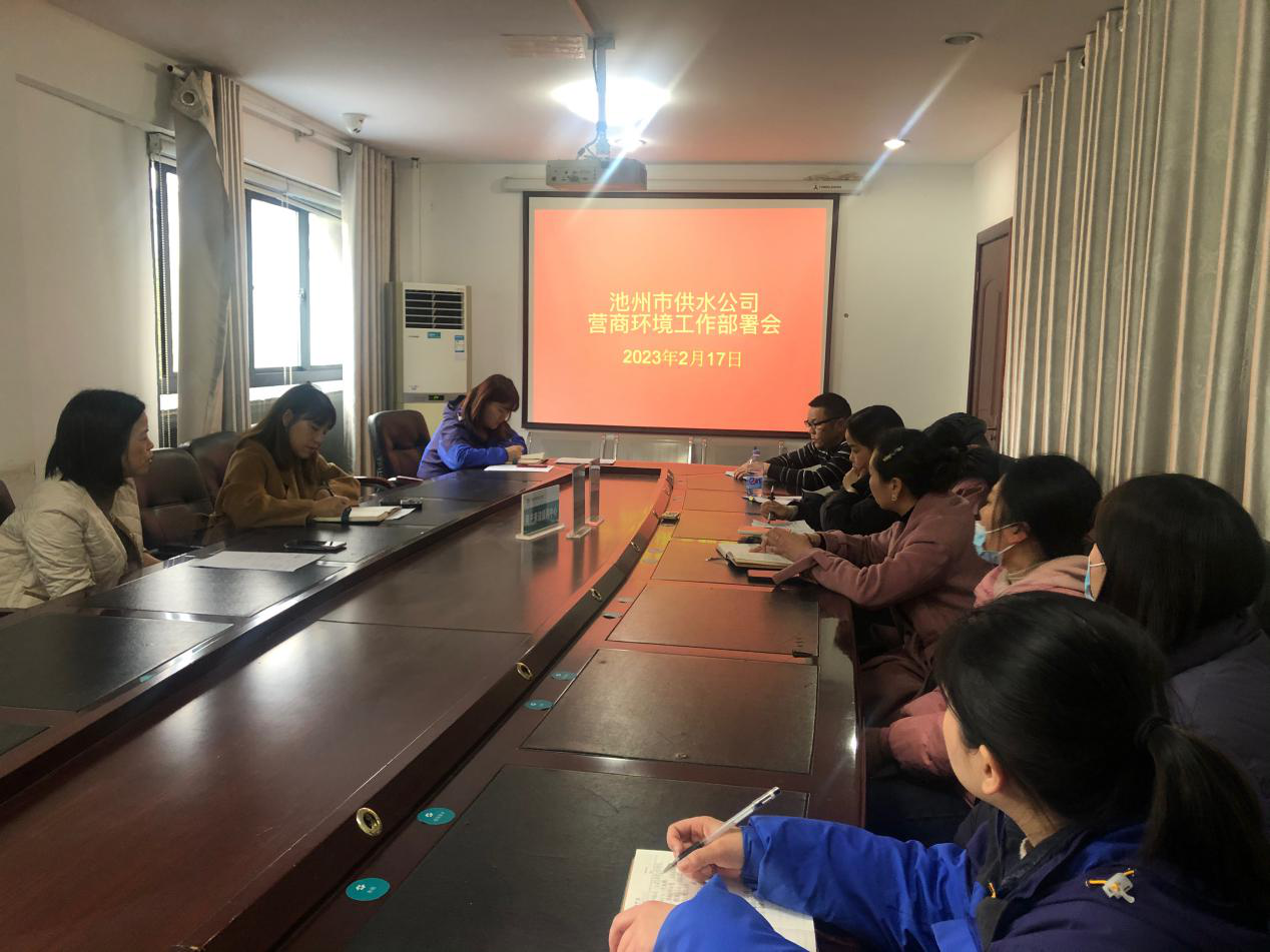 為推進(jìn)新一輪的營(yíng)商環(huán)境工作,2月17日下午,池州市供水公司營(yíng)商環(huán)境工作小組召開(kāi)了2023年營(yíng)商環(huán)境工作部署會(huì)。營(yíng)商環(huán)境工作小組組長(zhǎng)、公司工會(huì)主席施潔主持會(huì)議,營(yíng)商環(huán)境工作小組全體工作人員參加了會(huì)議。