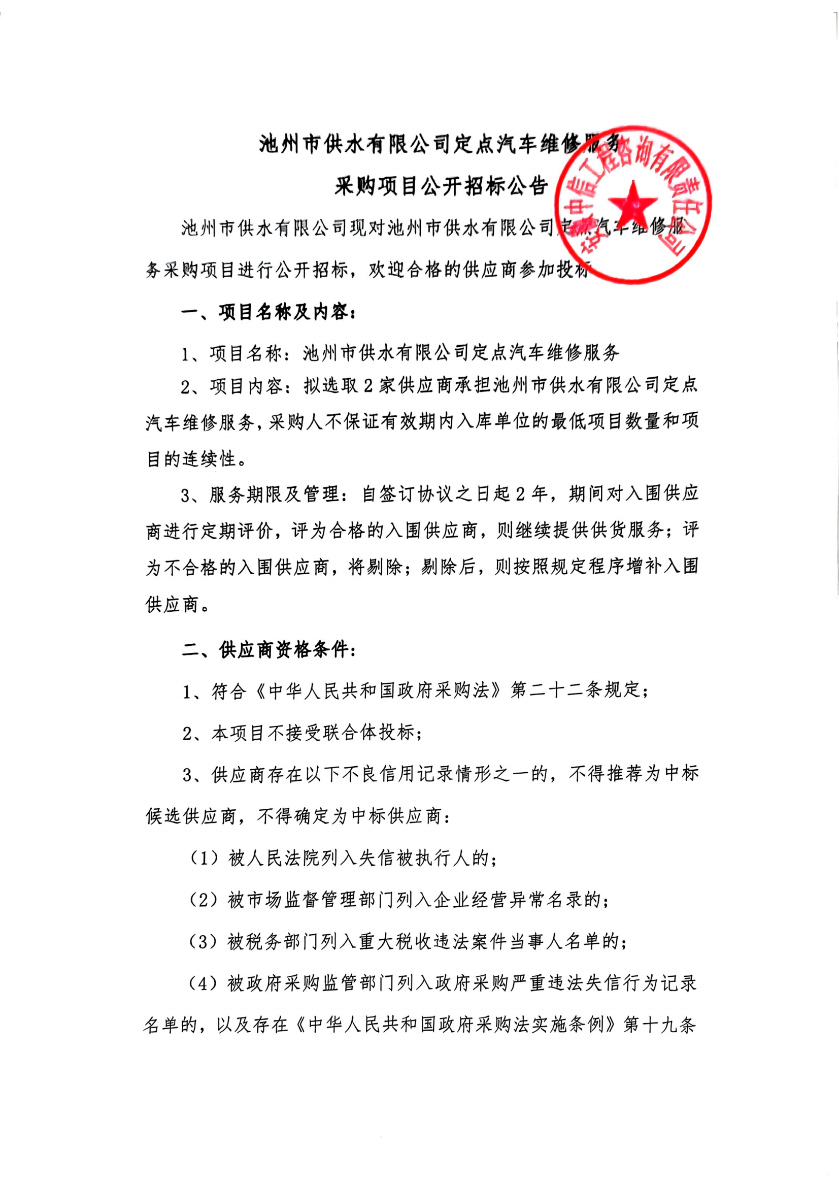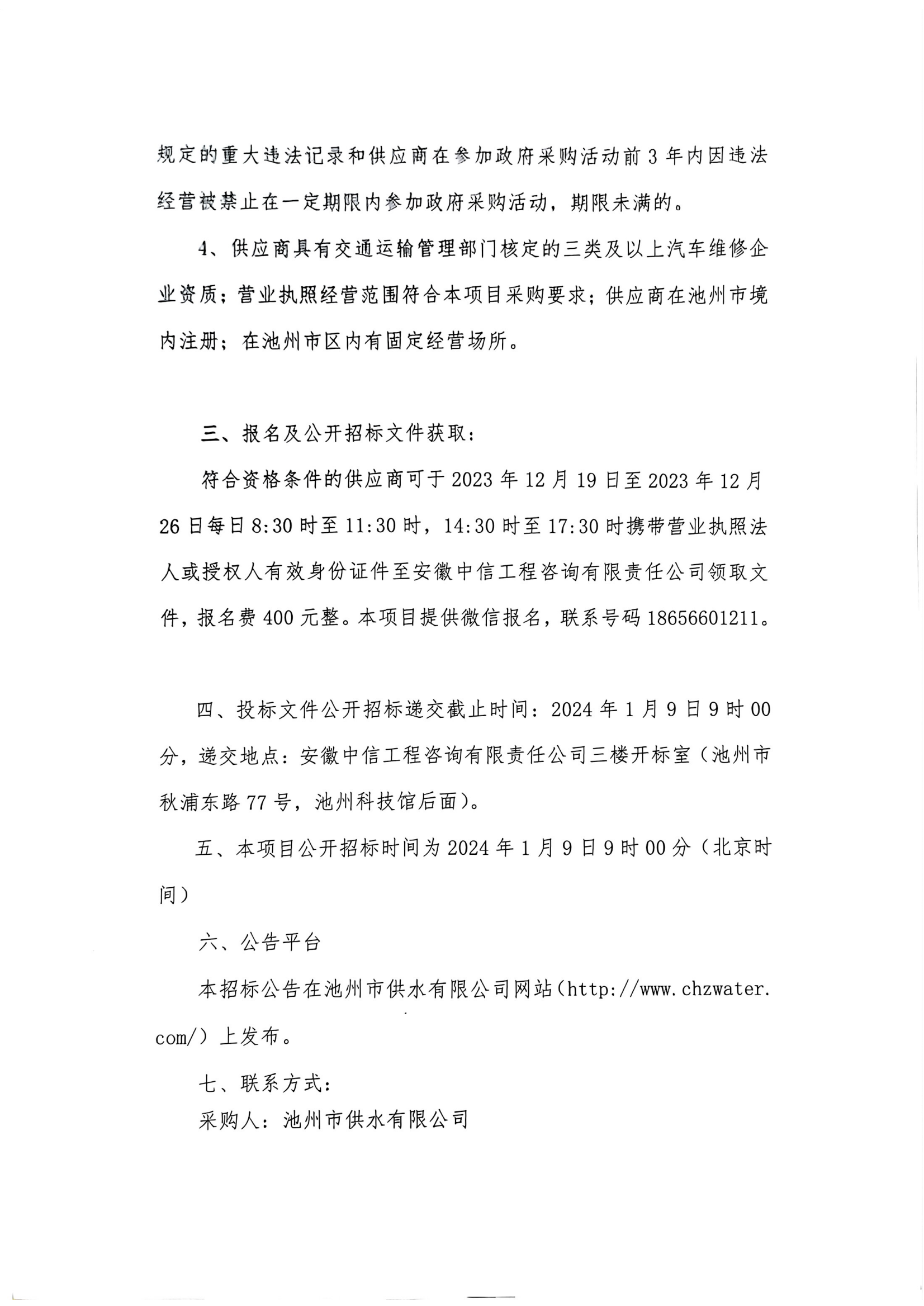 | 池州市供水有限公司定點汽車維修服務(wù)采購項目公開招標公告 | |