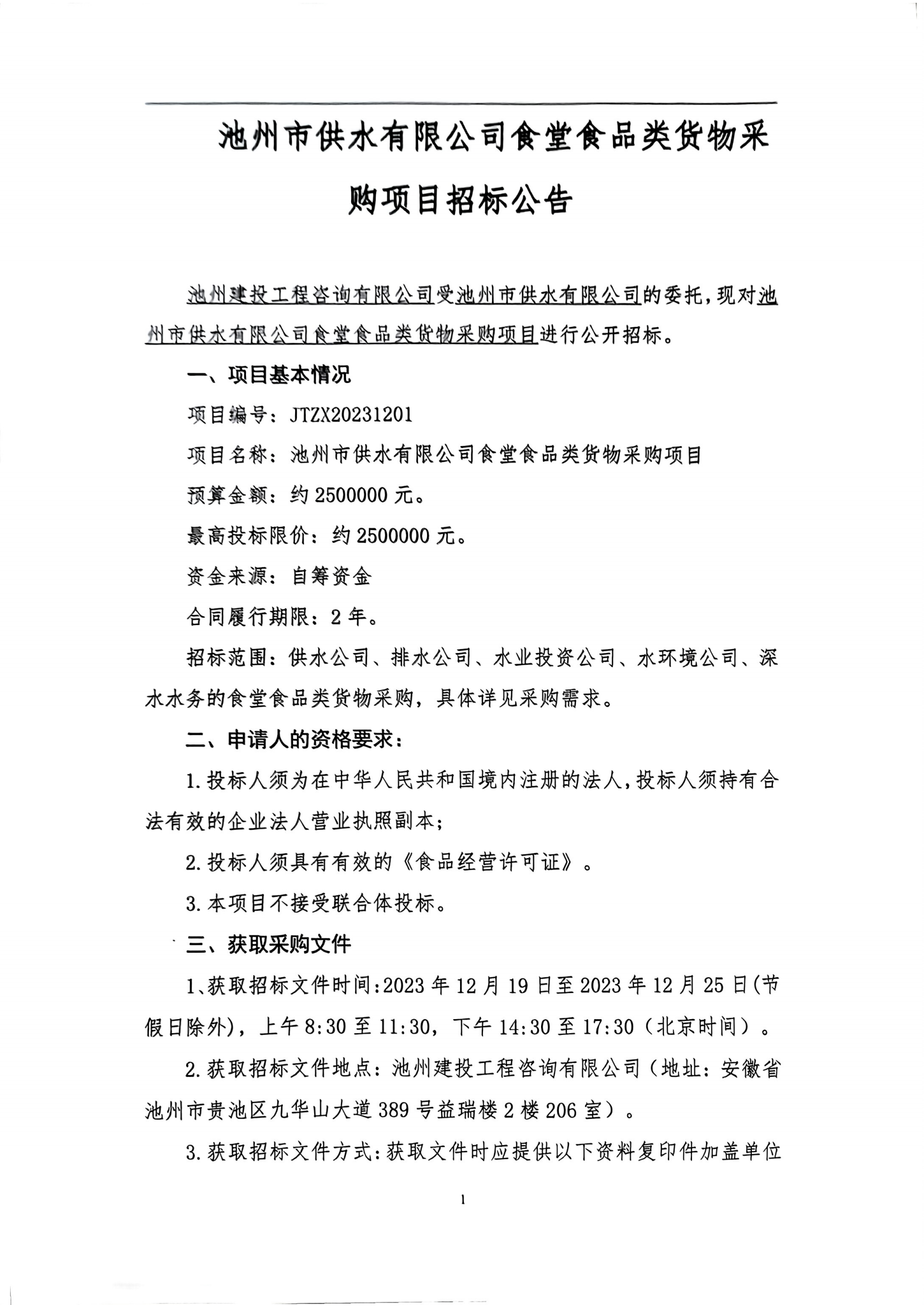 | 池州市供水有限公司食堂食品類貨物采購(gòu)項(xiàng)目招標(biāo)公告 | |