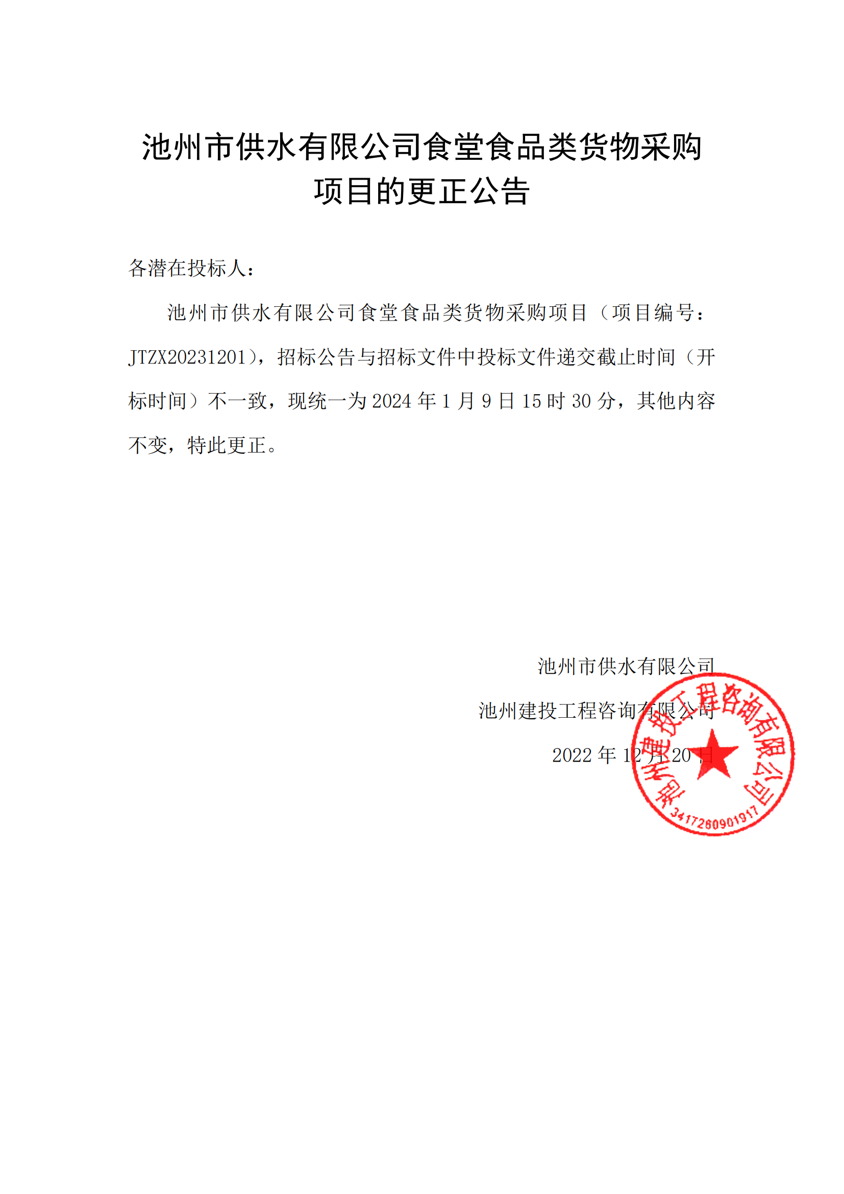 | 池州市供水有限公司食堂食品類(lèi)貨物采購(gòu)項(xiàng)目的更正公告 | |
