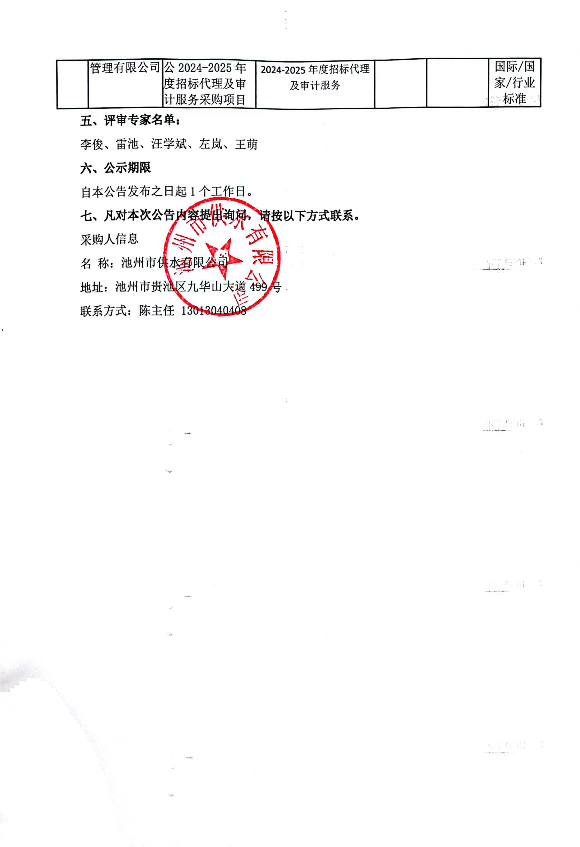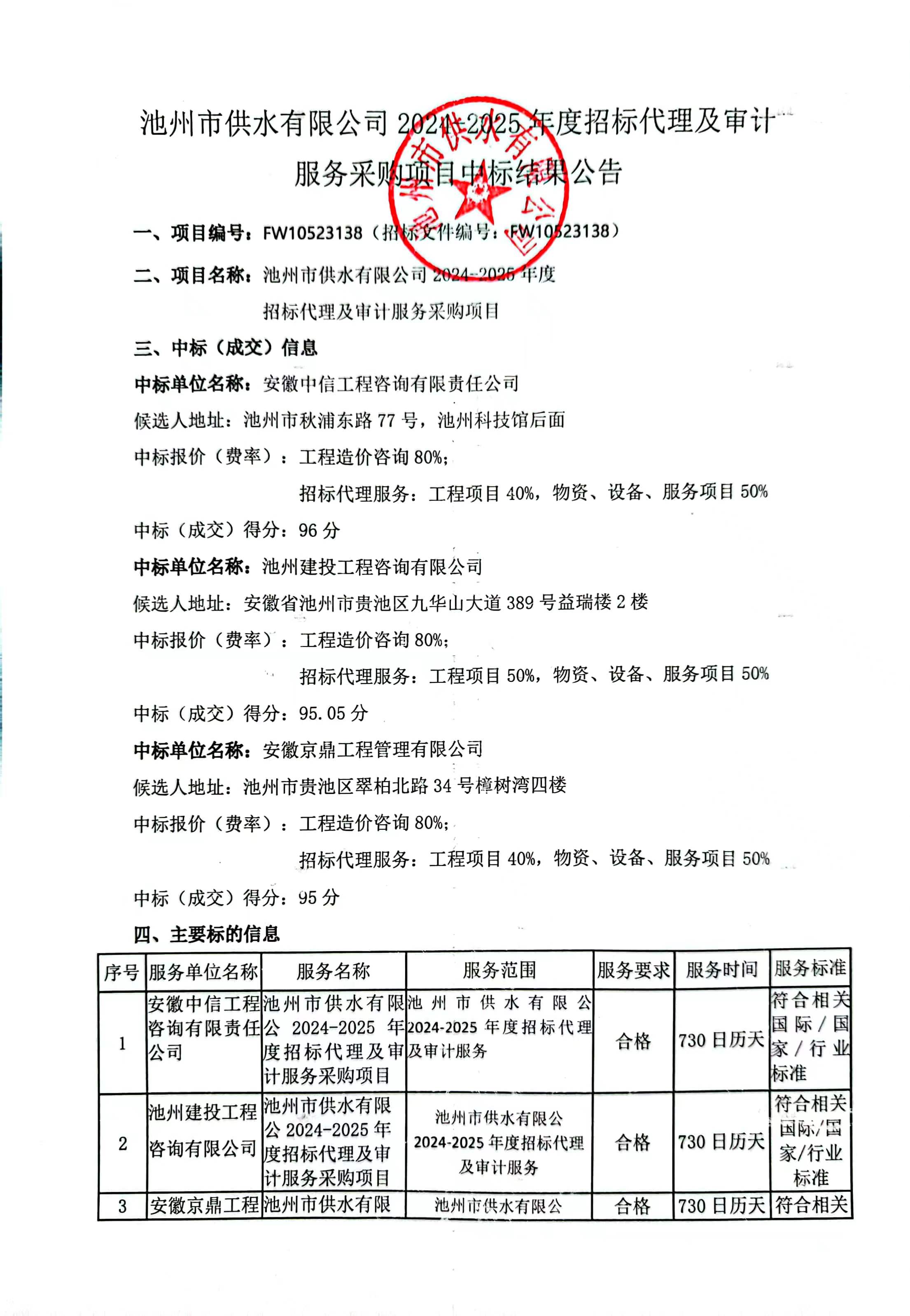| 池州市供水有限公司2024-2025年度招標代理及審計服務采購項目中標公告 | |