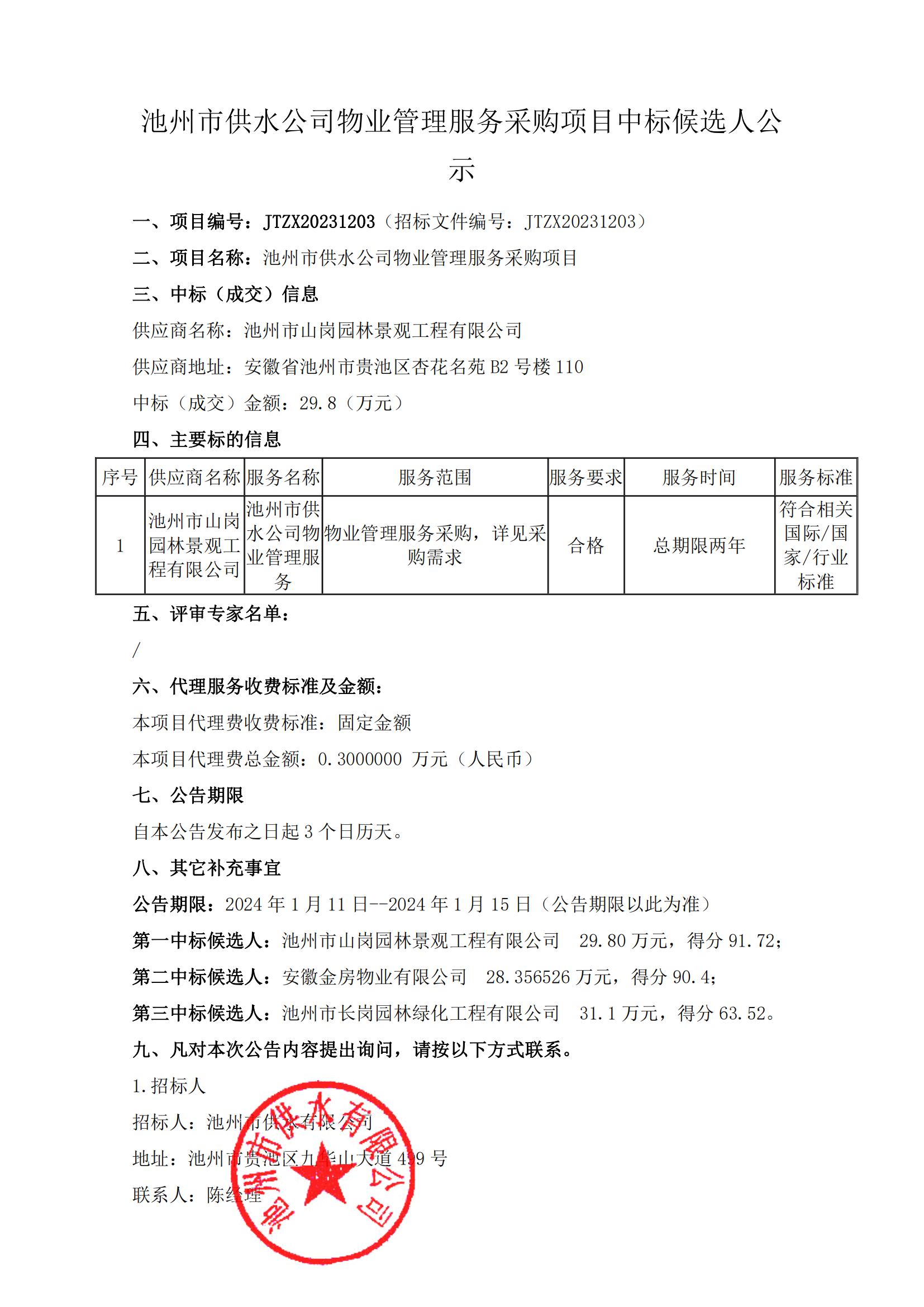 | 池州市供水公司物業(yè)管理服務(wù)采購(gòu)項(xiàng)目中標(biāo)候選人公示 | |