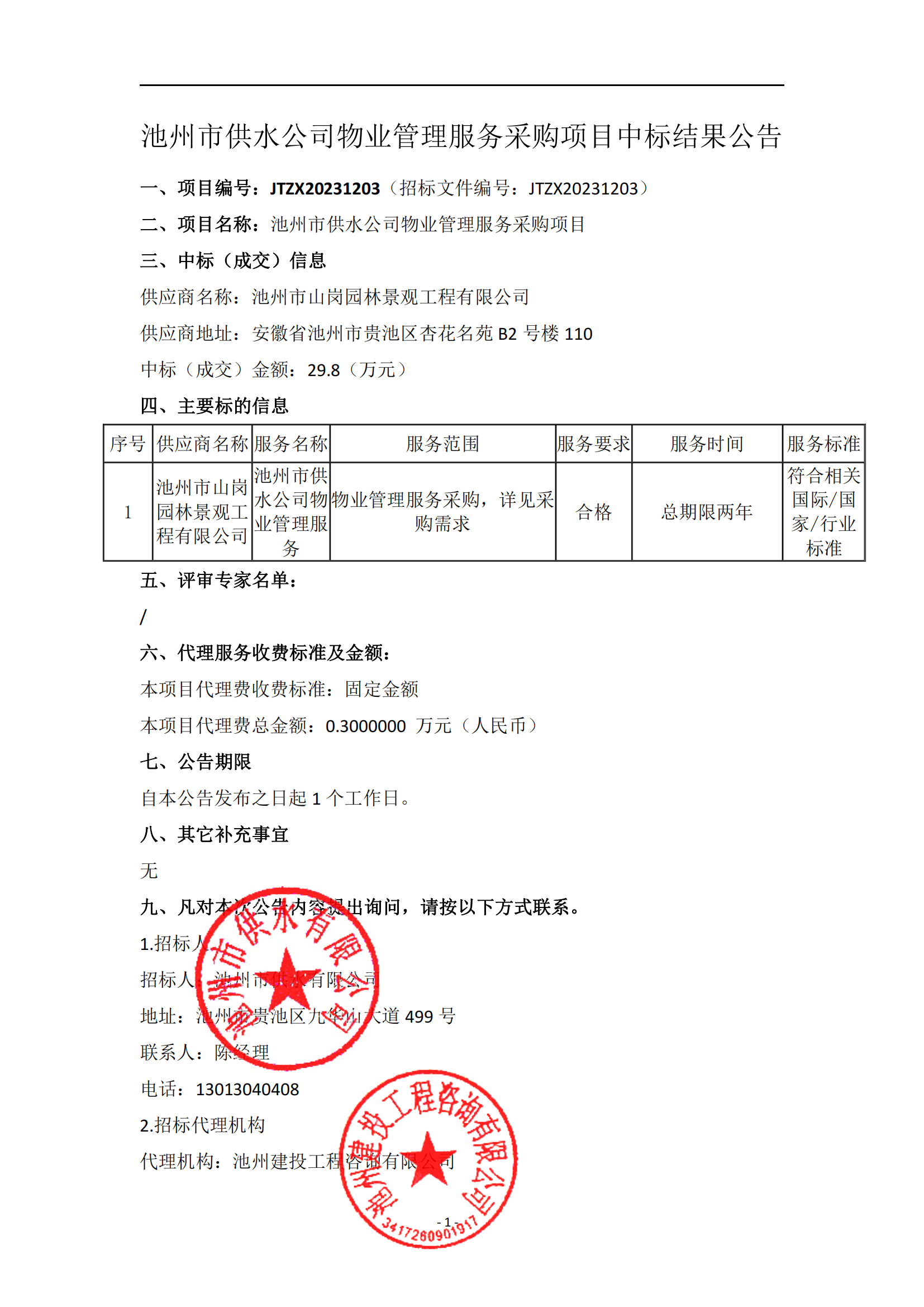 | 池州市供水公司物業(yè)管理服務(wù)采購(gòu)項(xiàng)目中標(biāo)結(jié)果公告 | |