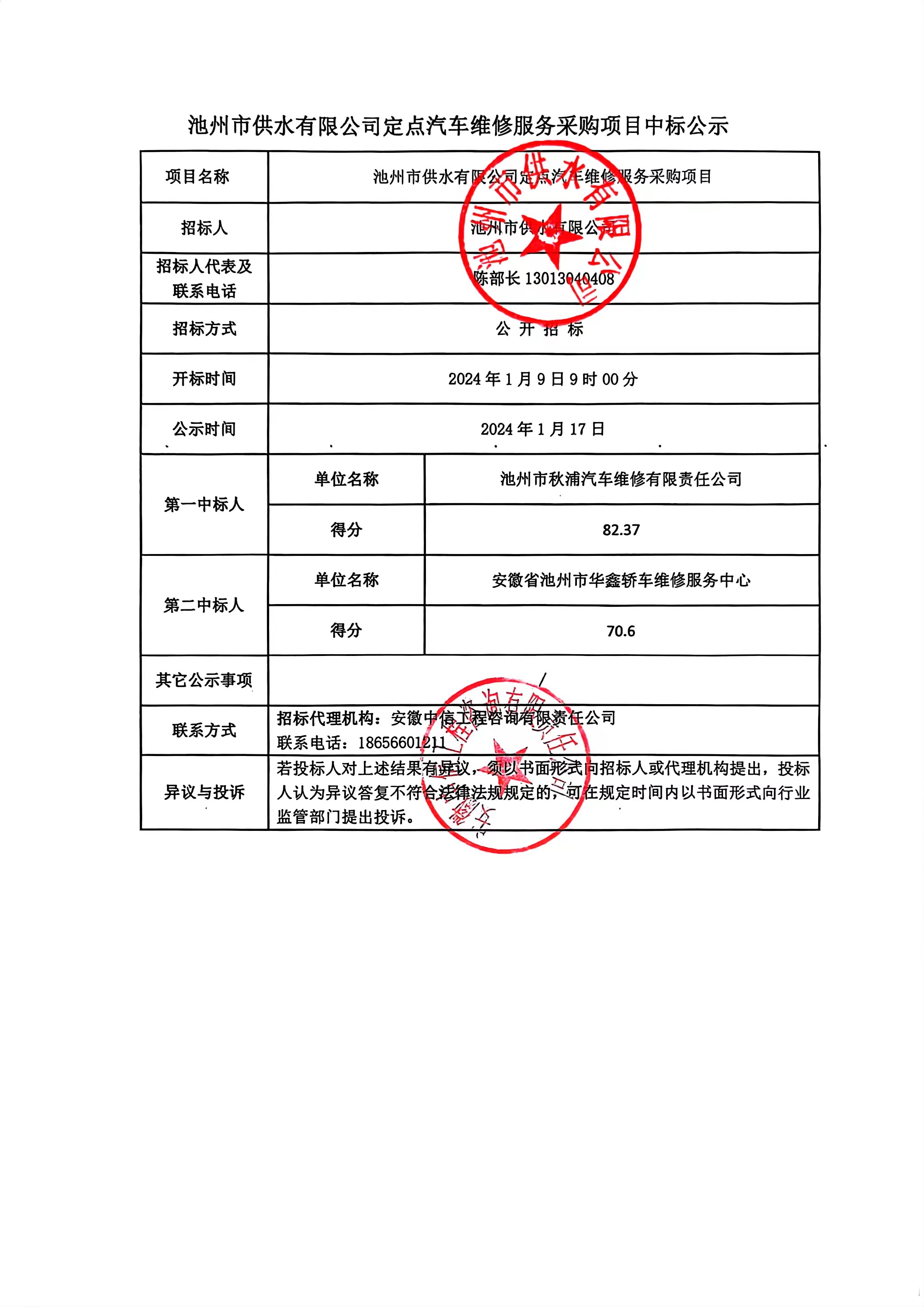 | 池州市供水有限公司定點(diǎn)汽車維修服務(wù)采購(gòu)項(xiàng)目中標(biāo)公示 | |