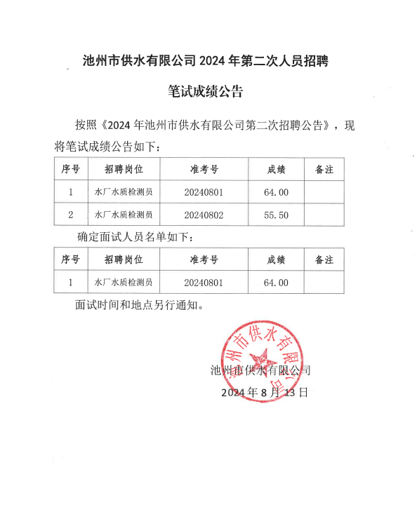 | 池州市供水有限公司2024年第二次招聘筆試成績公告 | |