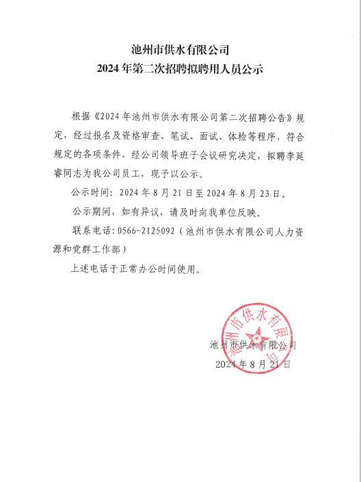 | 池州市供水有限公司2024年第二次招聘擬聘用人員公示 | |