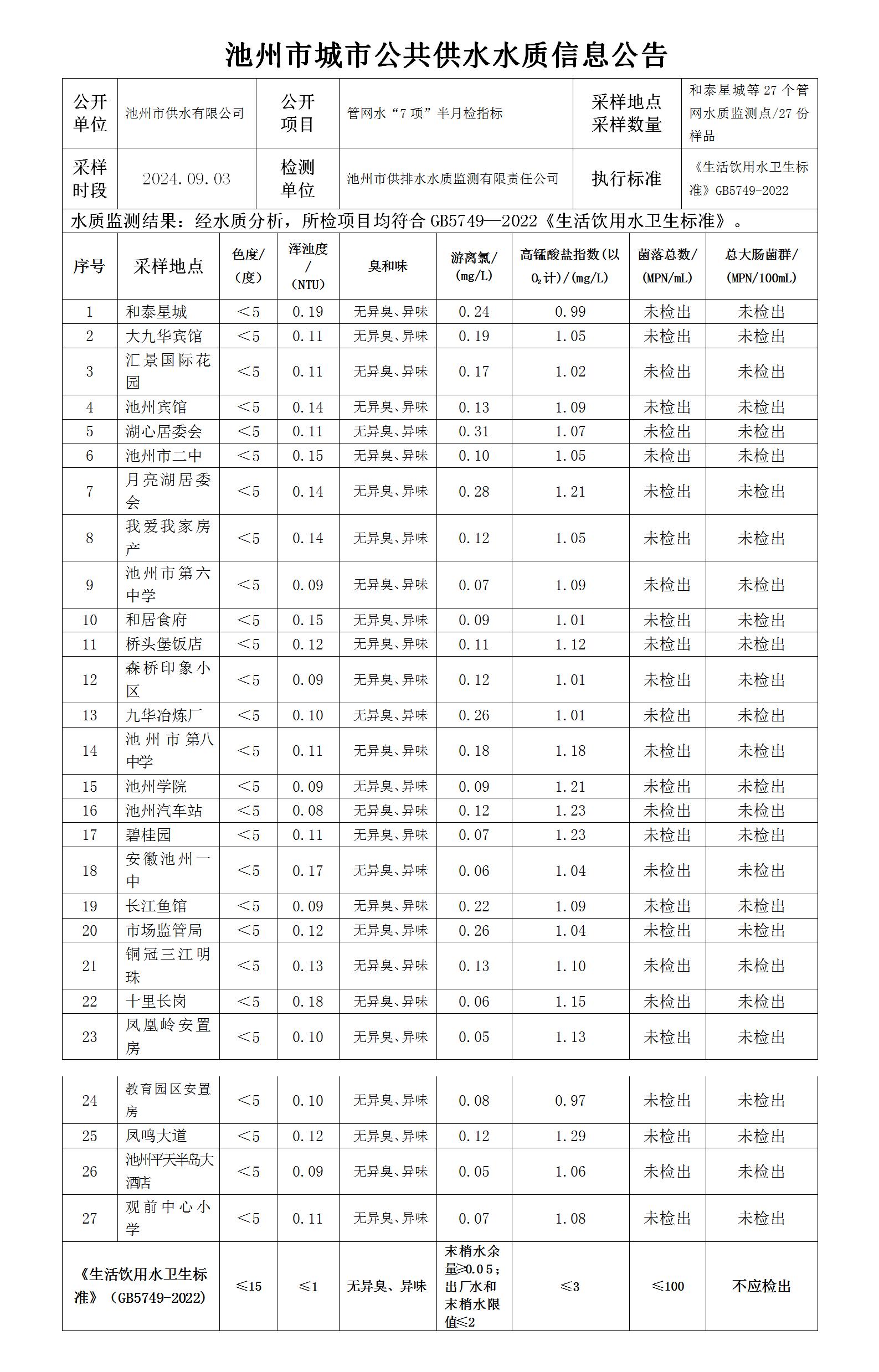 | 池州市城市公共供水水質信息公告管網水“7項”半月檢指標09-1 | |