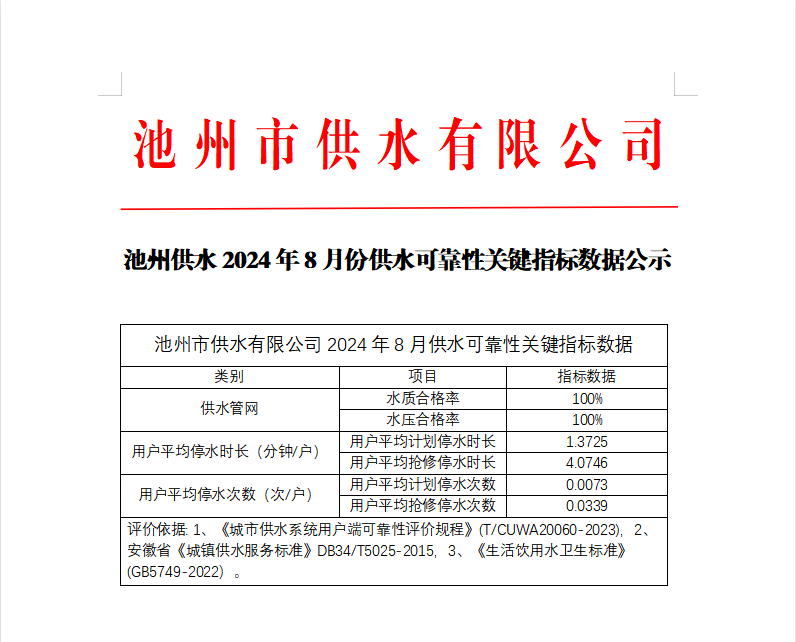 | 池州供水2024年8月份供水可靠性關(guān)鍵指標數(shù)據(jù)公示 | |