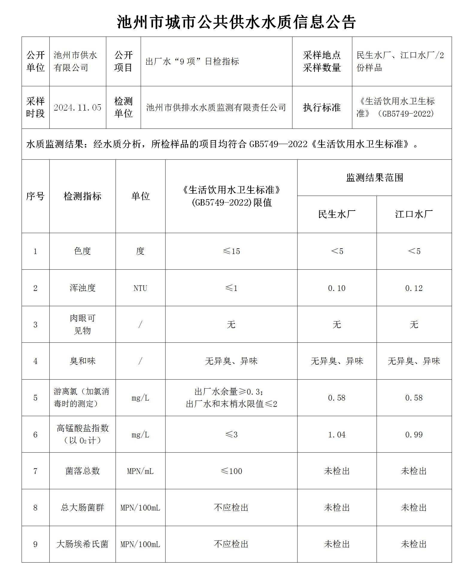 | 池州市城市公共供水水質(zhì)信息公告出廠水“9項”日檢指標(biāo)2024.11.05 | |