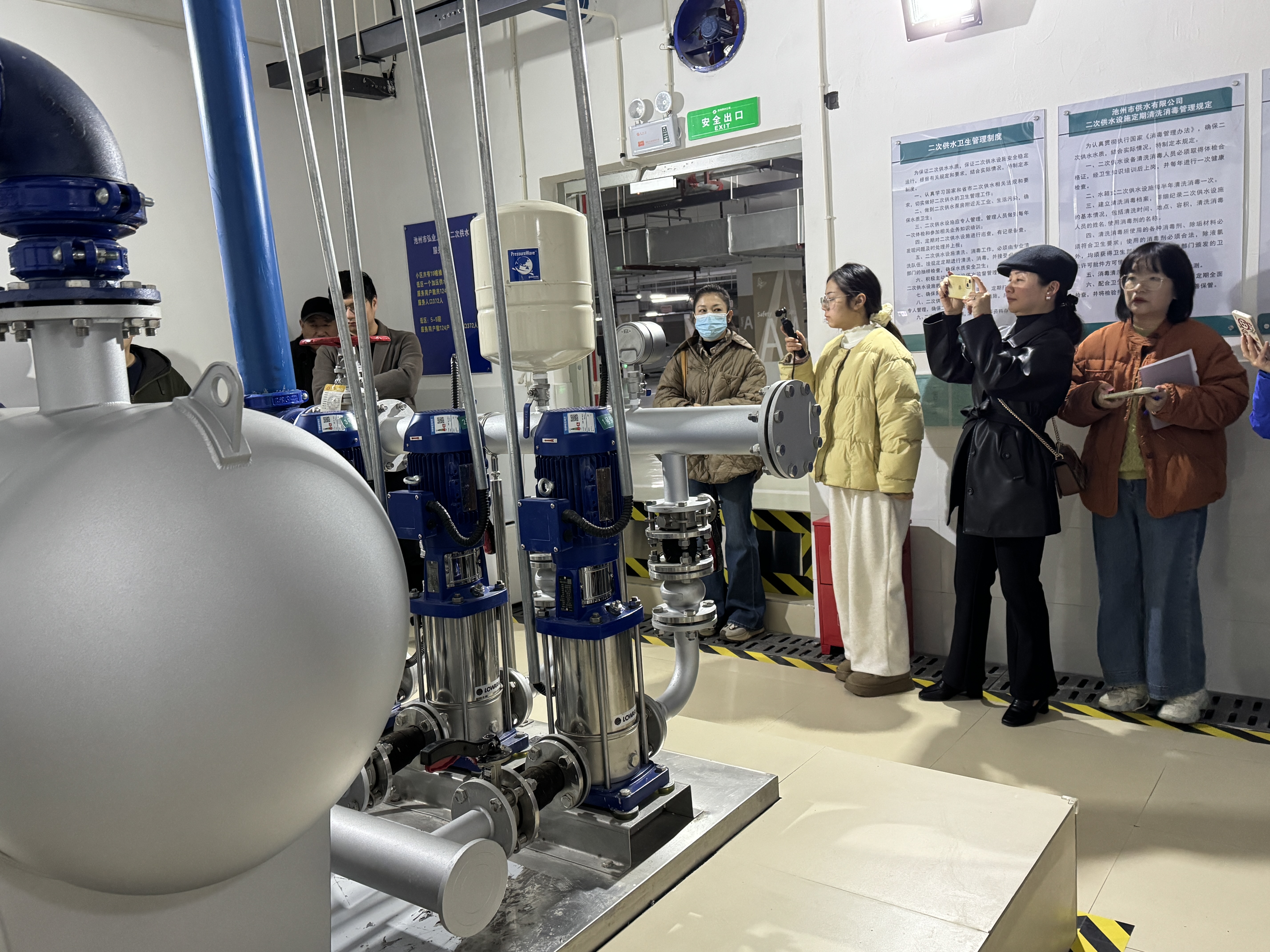 座談會前,用戶代表首先參觀了弘業(yè)上河琚小區(qū)二次供水泵站。該小區(qū)共有10幢樓,泵站設施先進,環(huán)境干凈整潔,服務用戶數(shù)124戶,服務人口372人。在現(xiàn)場工作人員的講解下,用戶代表對小區(qū)內二次供水流程以及供水泵站的設備運轉情況有了更加深入的認識,工作人員還詳細介紹了水廠的出廠水水壓、水質以及自來水與日常生活生產相關的信息,并就客戶關心的問題進行一一解答。