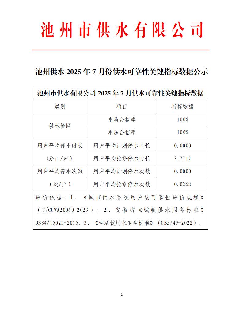 | 池州供水2025年7月份供水可靠性關(guān)鍵指標(biāo)數(shù)據(jù)公示 | |