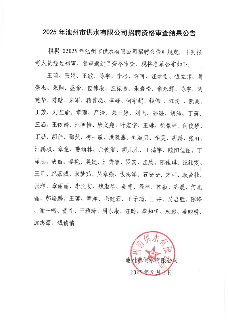 | 2025年池州市供水有限公司招聘資格審查結(jié)果公告 | |