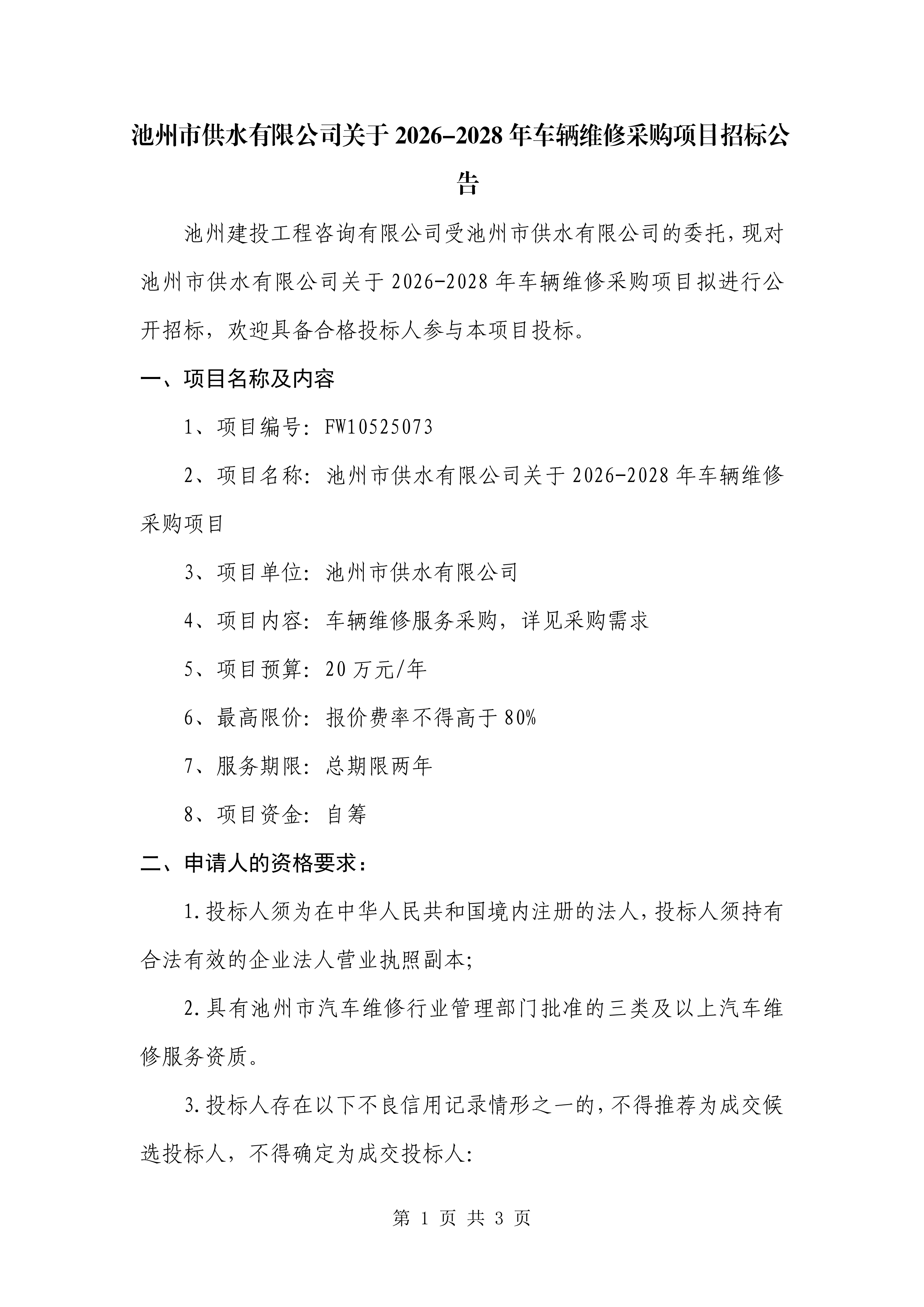 | 池州市供水有限公司關(guān)于2026-2028年車輛維修采購項目招標(biāo)公告 | |