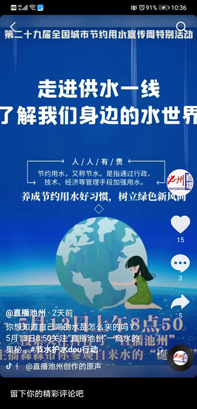 抖音直播 為了讓更多不能來現(xiàn)場(chǎng)實(shí)地參觀的市民們能近距離觀看制水過程,公司還邀請(qǐng)了今日頭條、安徽新聞網(wǎng)工作人員,利用抖音直播方式實(shí)現(xiàn)實(shí)時(shí)直播“民生水廠開放日”活動(dòng)。這一線上直播方式是當(dāng)下民眾的新寵,他們可以足不出戶就能親臨現(xiàn)場(chǎng),甚至比在場(chǎng)觀眾更能看到細(xì)微和整體。今日頭條“直播池州”和安徽新聞“今日池州”兩大直播平臺(tái)受眾多、影響大,傳播速度快,是池州本地最受歡迎的網(wǎng)絡(luò)媒體。本次線上直播共吸引受眾1.5萬余人現(xiàn)場(chǎng)觀看、點(diǎn)評(píng),大大提升了池州供水知名度和“節(jié)水意識(shí)”的傳播。