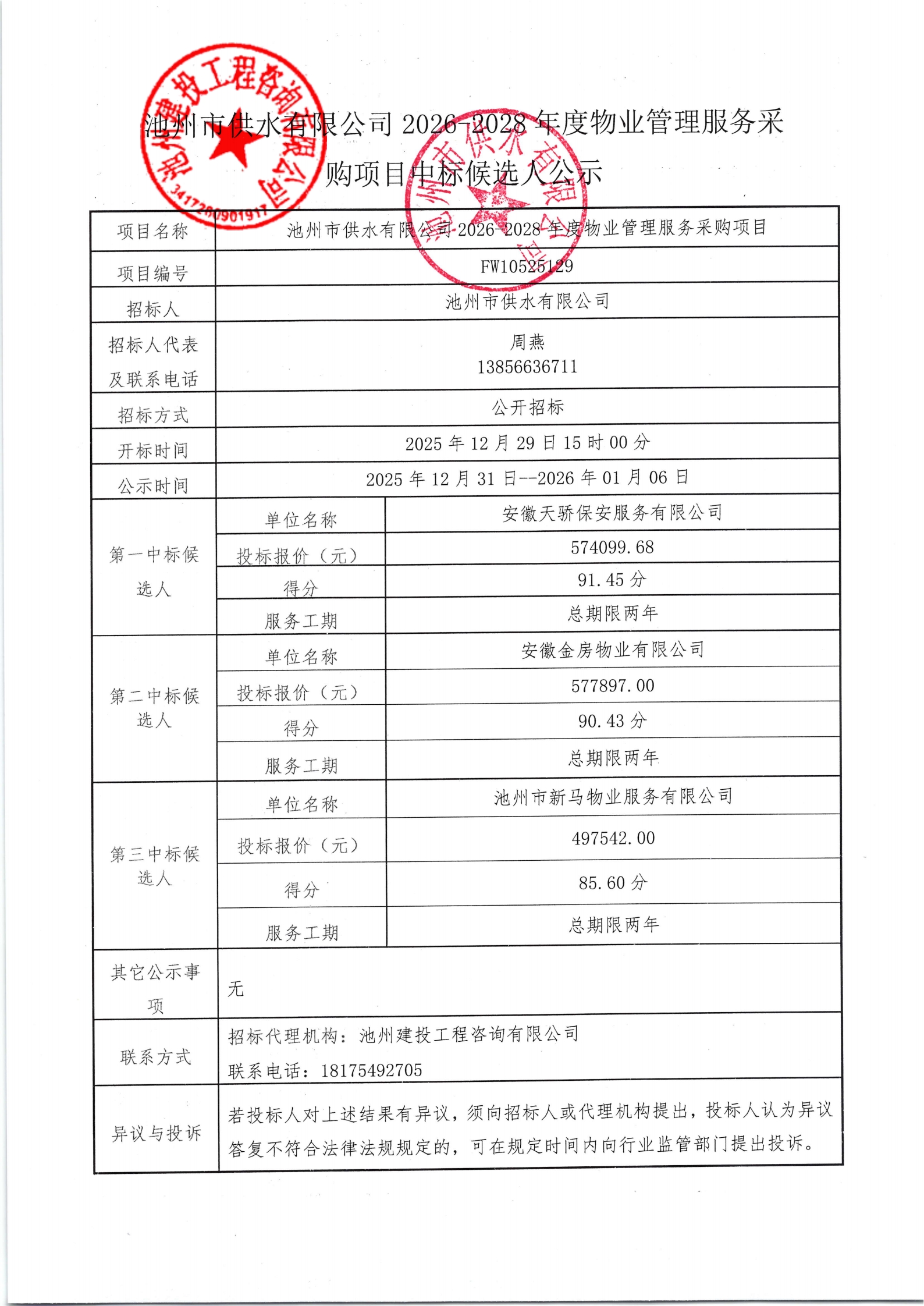 | 池州市供水有限公司2026-2028年度物業(yè)管理服務采購項目中標候選人公示 | |