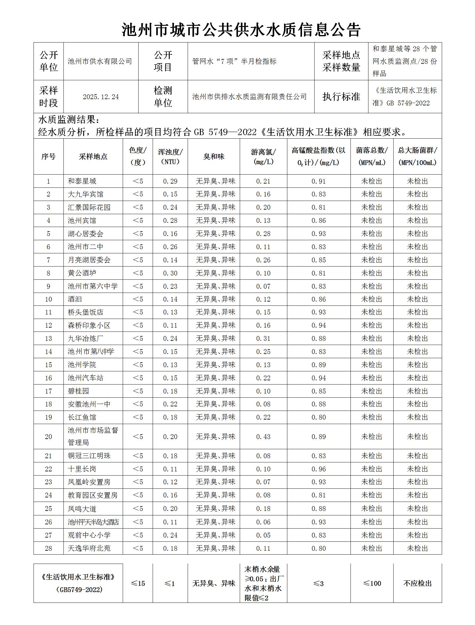 | 池州市城市公共供水水質(zhì)信息公告管網(wǎng)水“7項(xiàng)”半月檢指標(biāo)20251224 | |