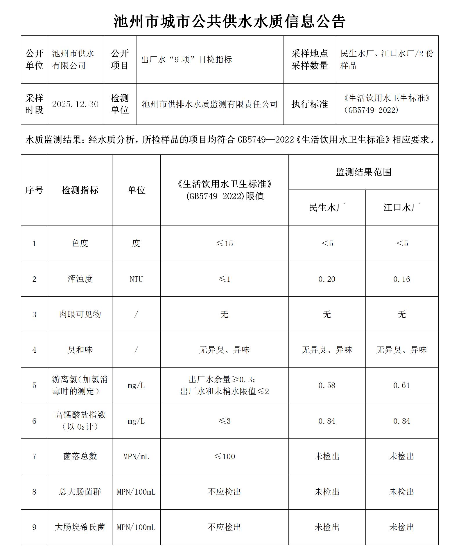 | 池州市城市公共供水水質(zhì)信息公告出廠水“9項(xiàng)”日檢指標(biāo)2025.12.30 | |